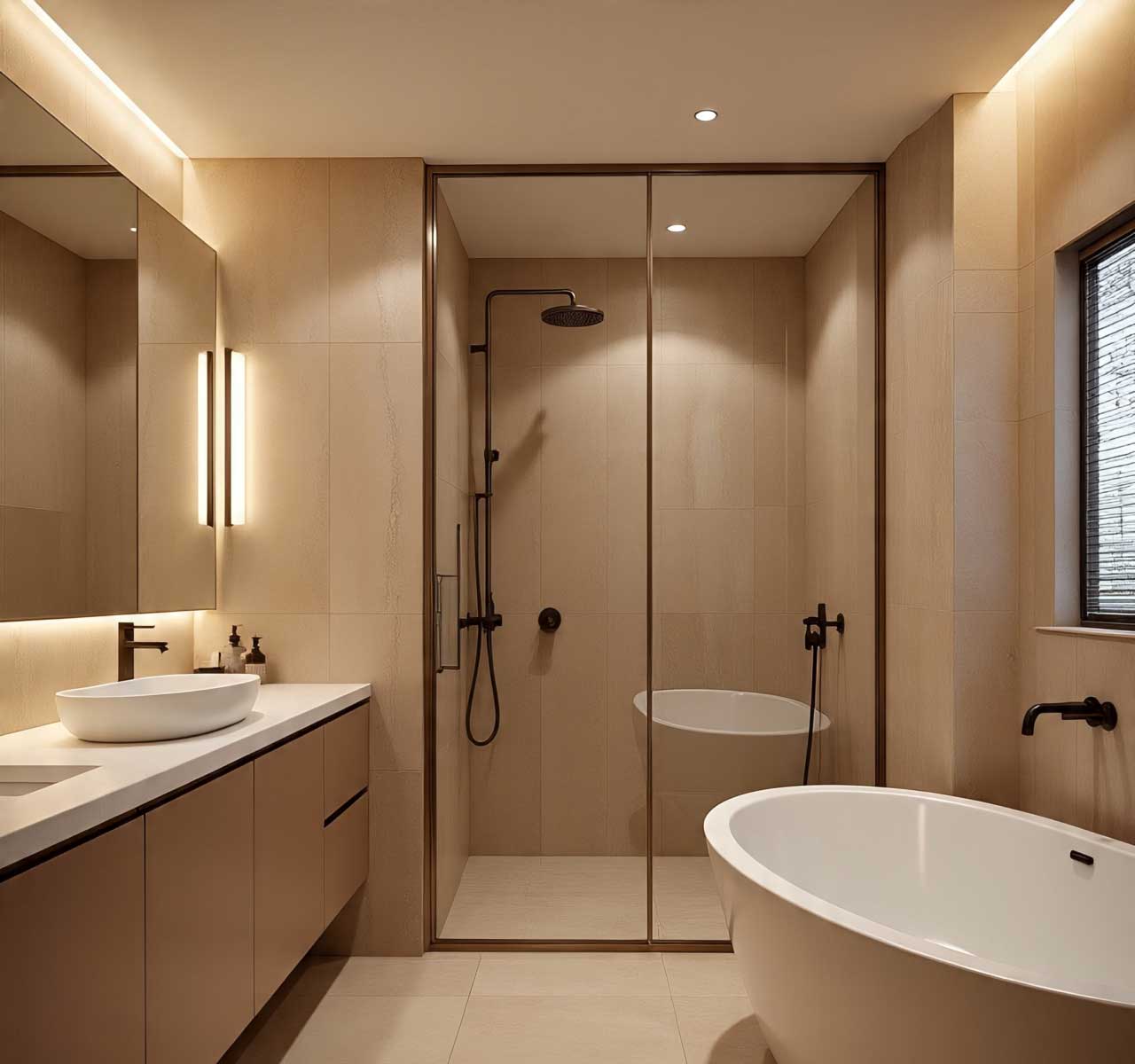 - Pencahayaan: Gunakan kombinasi pencahayaan alami dan buatan. Cahaya alami membuat kamar mandi lebih segar, sementara pencahayaan buatan bisa diatur untuk suasana berbeda.